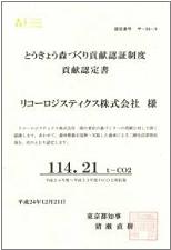 この認証制度は、東京都の森林の育成と活用に大きな貢献を行う団体とその活動の認証を行うもので、リコーロジスティクスグループでは、「企業の森」活動における森林の維持整備活動と、同活動によって森林が10年間に吸収するCO2 114.21トンが認定されました。